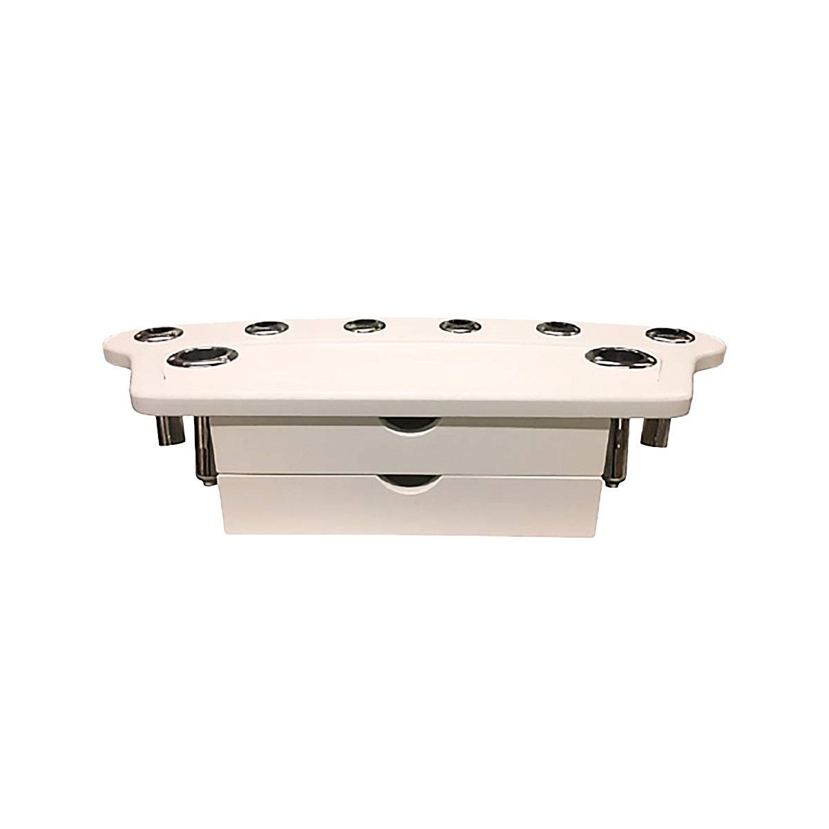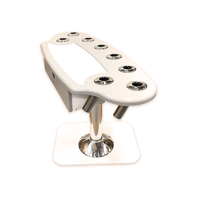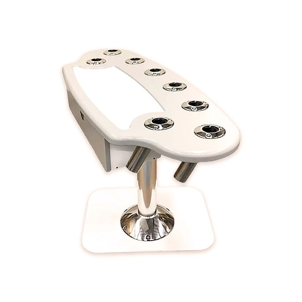 Arrigoni’s 8 Rod Poly Frame Rocket Launcher is a beautiful and functional accessory for your vessel. Shown here in optional Custom Color Dolphin Grey.Hand crafted from the highest-quality materials in our Connecticut shop, we offer unlimited customizable options. Offering King Starboard or teak construction, in all sizes, layouts and designs to meet your fishing demands. Decide your rod and cup holder layout, drawers for bait, terminal tackle, or lures, and multiple non-skid options. Working on a smaller platform? Our pedestal design allows boat owners to remove the pedestal and rocket launcher when not needed. Call today discuss pricing and build options! Shown here is our all polyethylene (King Starboard) 6-rod rocket launcher. Low-maintenance design, featuring 8 stainless steel rod holders. Shown with our optional double-drawer and knife holder slots. High-quality 30″ aluminum pedestal and mounting hardware included.
