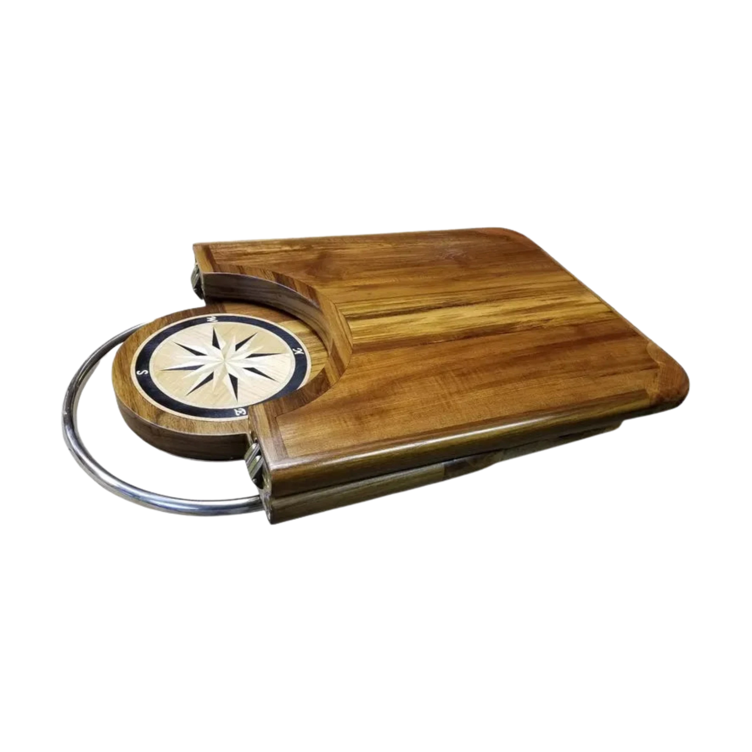 - Pictured: Single fold-over leaf table top crafted with a marine-grade veneer core and finished in semi-gloss, featuring an optional compass rose inlay. Shown on an adjustable height pedestal (sold separately).