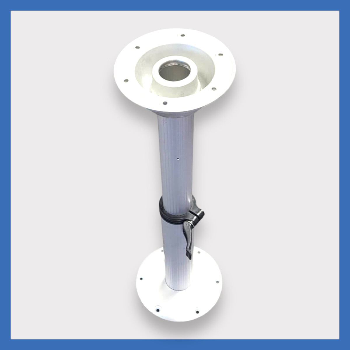 Our pneumatically adjustable aluminum pedestal. Height range of 20” up to 30” Pricing includes deck and table plates as shown.