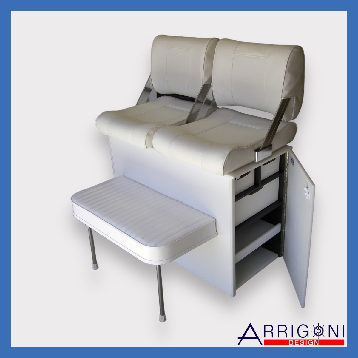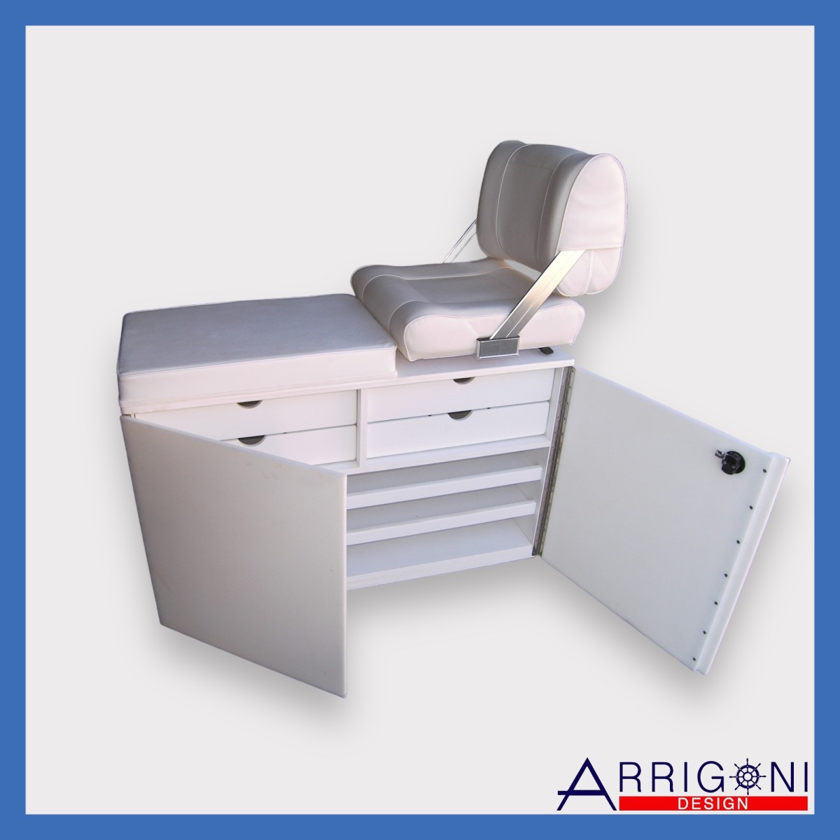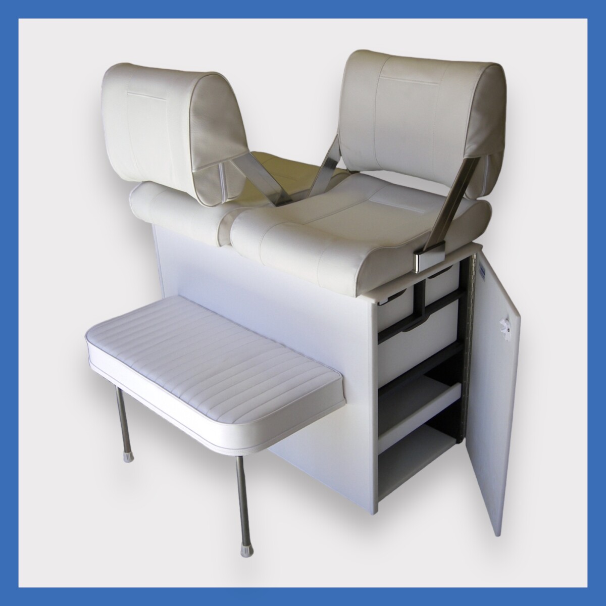Our swing back seat locker can replace an average helm seat to provide a more comfortable ride, versatile functionality, and convenient extra storage. Featuring 4 oversized pull out drawers with customizable dividers, hidden behind two lockable, waterproof doors. PLUS storage room for a cooler or tackle boxes. Our swing back seat in marine-grade vinyl allows you to adjust the backrest forward or aft as needed. Locker is constructed of high-quality, maintenance-free King Starboard polyethylene. The CSL-2 will securely mount to any flat deck surface.
