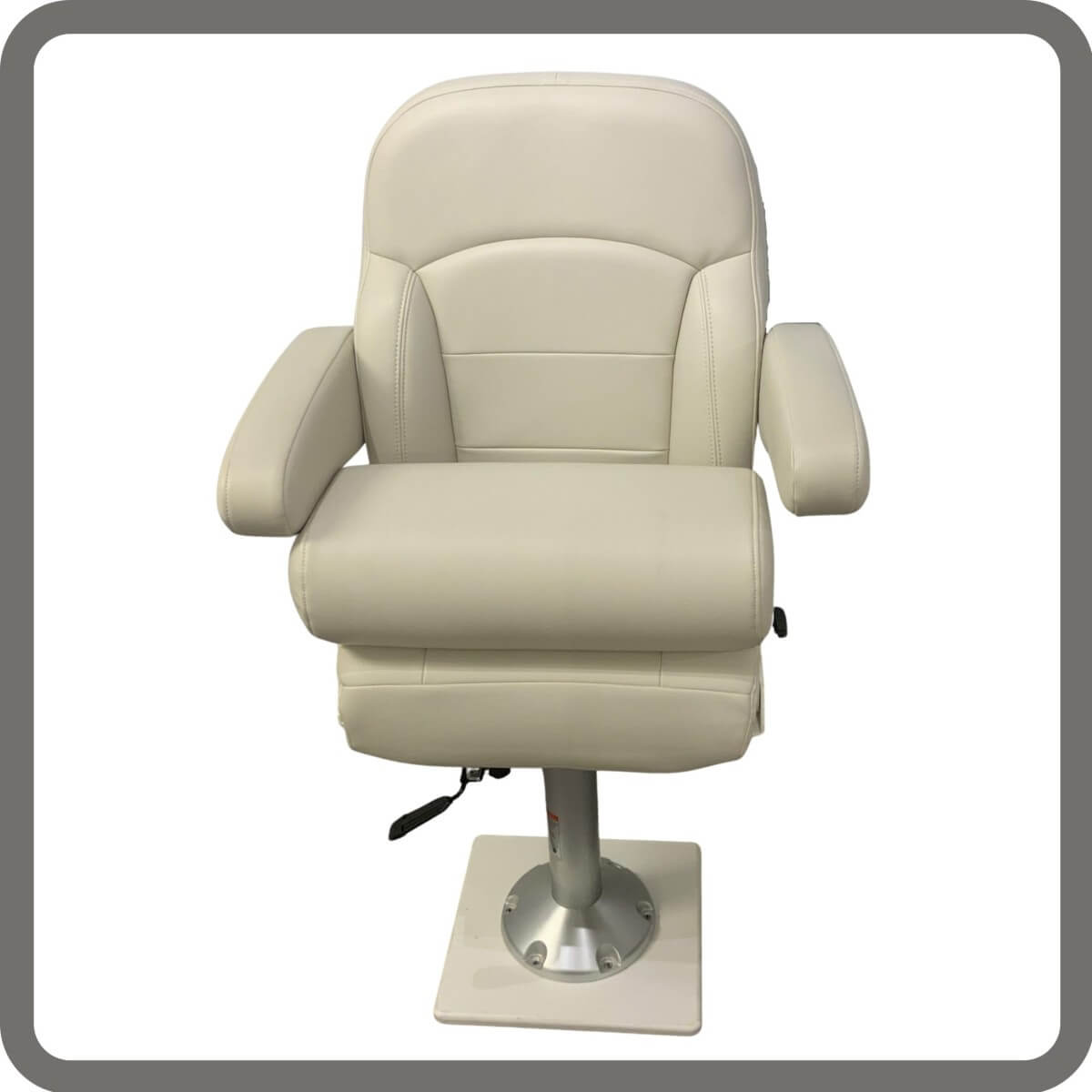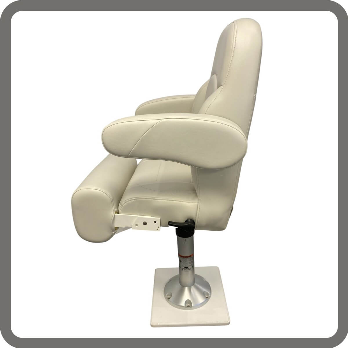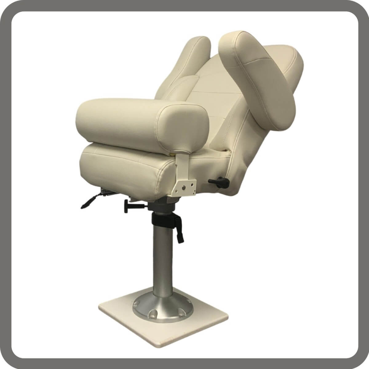 Our deluxe MK-3B helm seat offers maximum cruising comfort, with fantastic cushioned support, a pop-up bolster for standing while driving, and a reclining back. The fold-up armrests on this boat bolster seat allow for more maneuverability and easy slide in access. Constructed of high-quality materials and durable marine-grade vinyl, these captain’s chairs will be enjoyed for years to come. All of our MK helm seats come equipped with a slide and swivel assembly to fit your existing pedestal (no re-installation needed). Alternatively, we offer hardware for easy mounting on any flat deck surface of your boat.