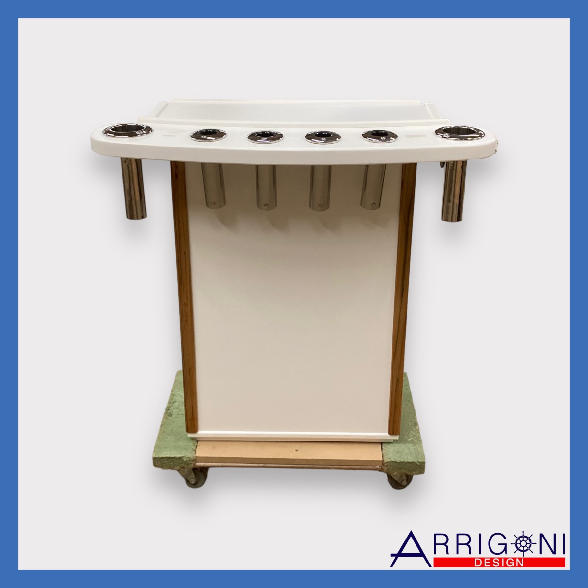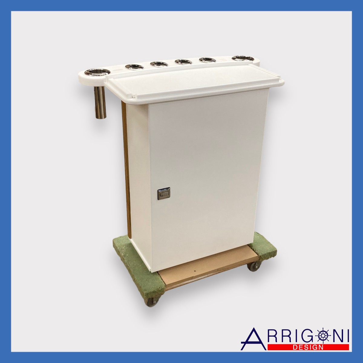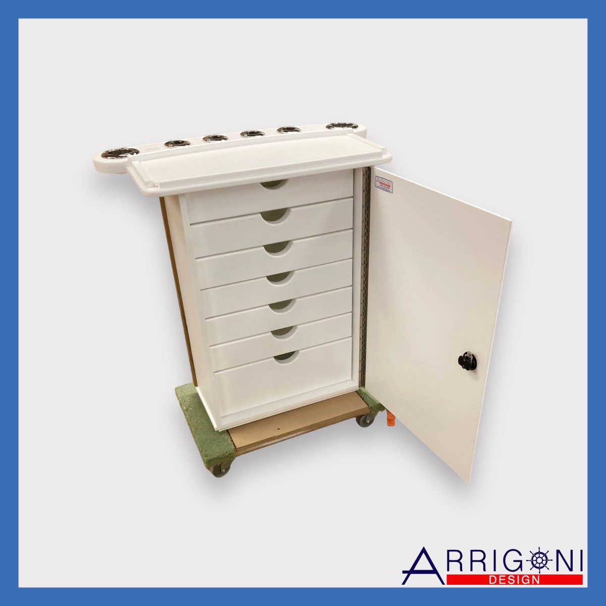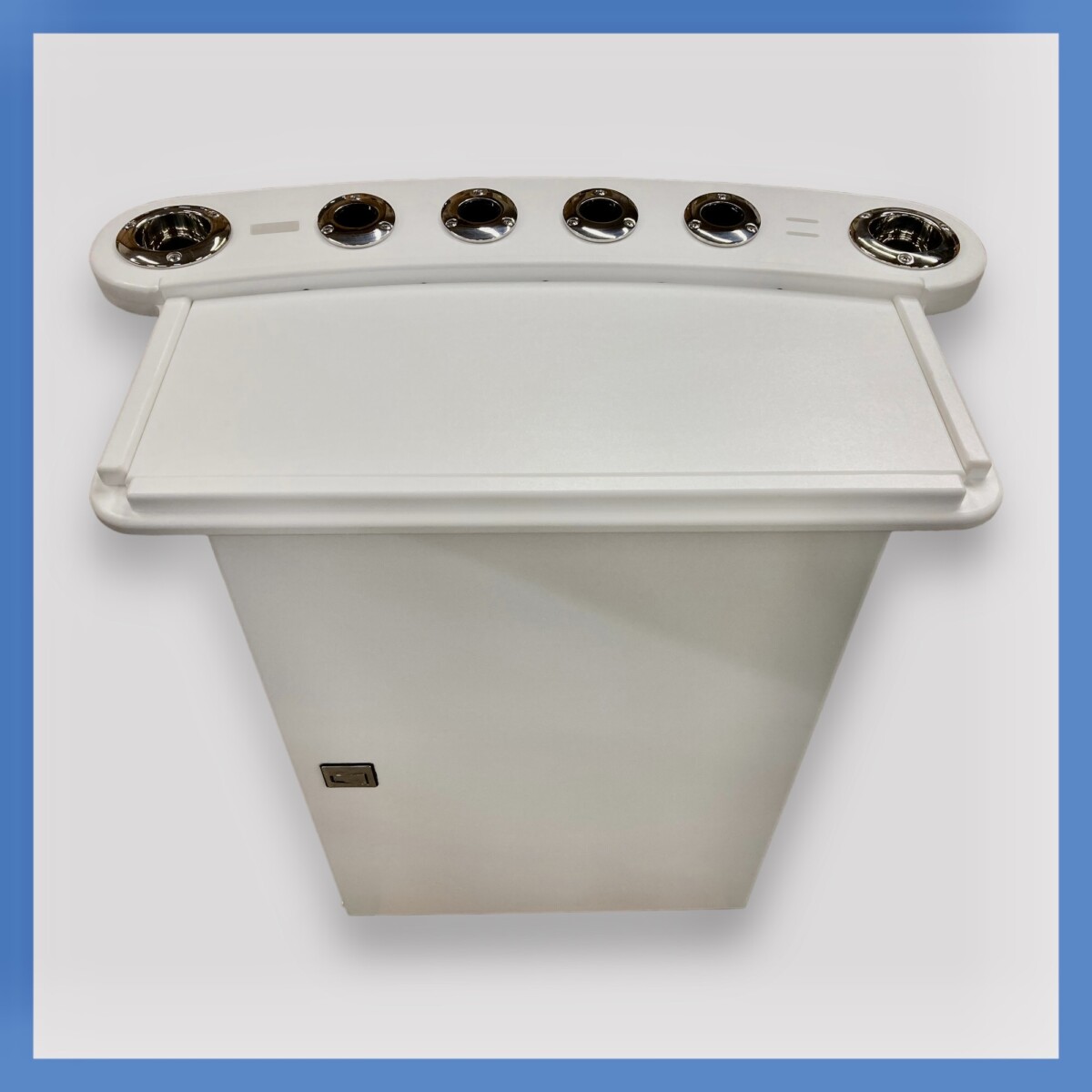 At Arrigoni Design, we manufacture all of our custom cabinetry, lockers, and insets from scratch. Each custom product is given individual care and consideration, built to your exact specifications. Our RTL-PC unit combines the features of our rocket launchers and custom storage lockers. Designed for center cockpit installation with a deck footprint of only 24″ x 12″ and topping out at 34″ high. Constructed of high-quality, maintenance-free King Starboard polyethylene. Integrated rigging tray and four stainless steel rod holders (can also be cup holders). Behind a lockable, waterproof door, you’ll find five large pull out drawers with customizable dividers -perfect for tackle and lure storage. Easily and securely mount this locker to any flat deck surface.