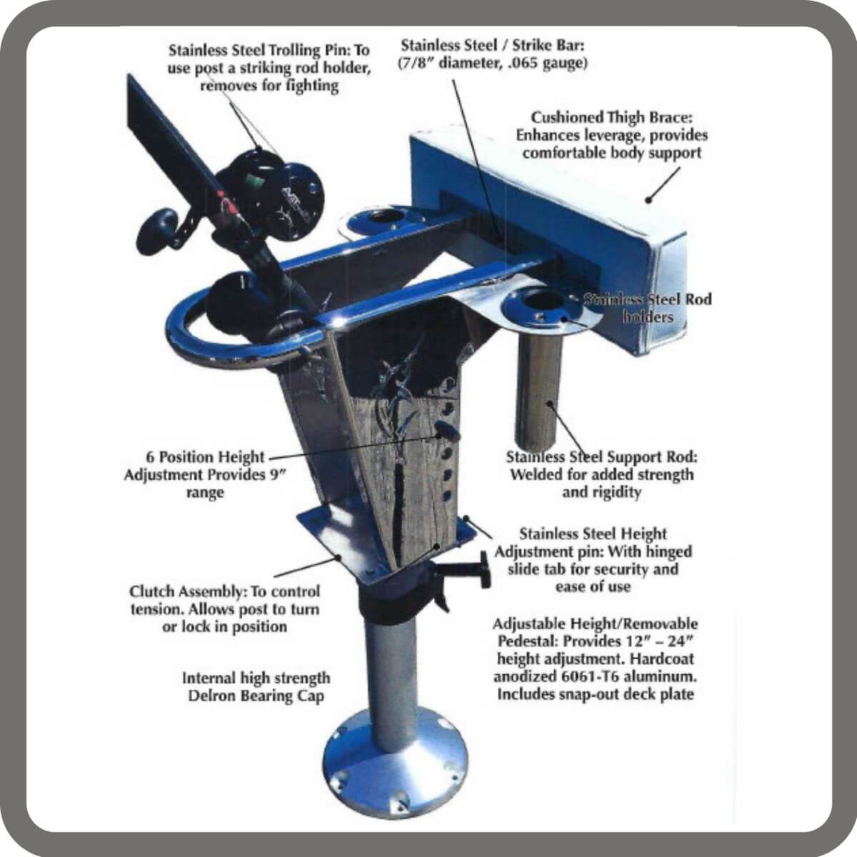 For boats lacking space for fighting chairs, the Arrigoni Samson Post provides a standing fighting station requiring only a 12″ turning radius. Insert your straight or bent-butt rod into the gimbaled holder – when a fish strikes, use the full 45-degree fighting arc. Our post enhances your strength and reduces reeling fatigue by providing both a fulcrum for your rod and a cushioned brace for your body. Adjust the height as needed for maximum rod control and comfort. Performance engineered, constructed of 304 stainless steel, and electro polished for a lasting and durable finish. Perfect for center consoles or large offshore sport fishermen (extra fighting stations are always a good idea!).