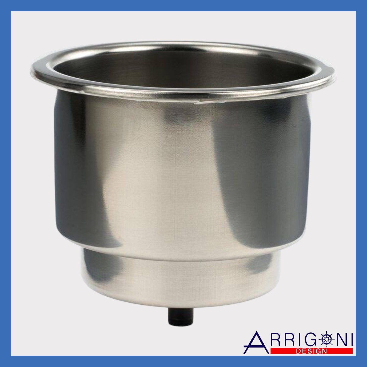 Crafted from top-grade stainless steel to withstand the test of time and elements, this cup holder can be installed on any custom Arrigoni Design Rocket Launcher or Table. DRAIN HOLE INCLUDED