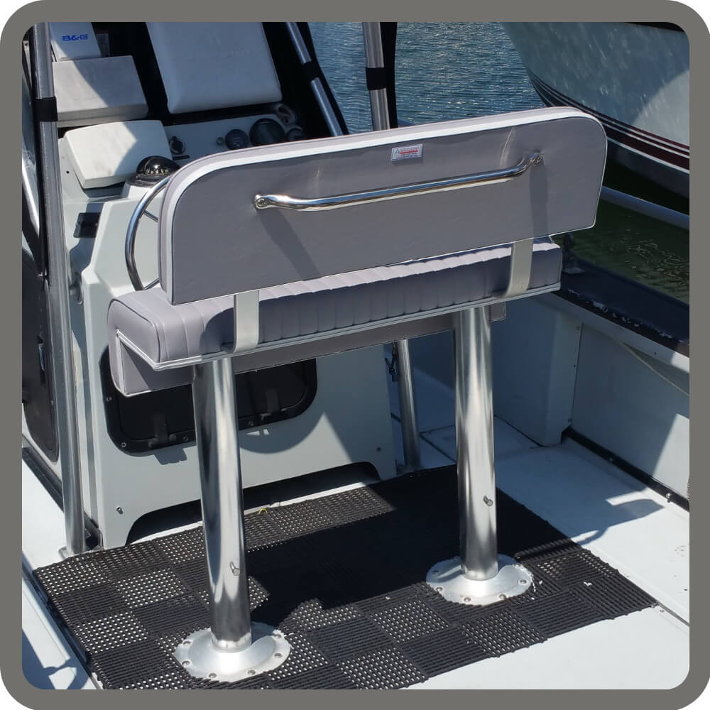 Handcrafted from the highest-quality materials, this cushioned leaning post provides comfort and convenience while fishing or driving at the helm. Also great for fly bridge applications. our boat leaning post is a versatile addition to your boat's setup. This product is built-to-order in our Connecticut shop, meaning you can customize the size, configuration, design, upholstery, and more. With nearly 3 decades of experience, we are always happy to discuss what we can build to meet your boating or fishing needs.