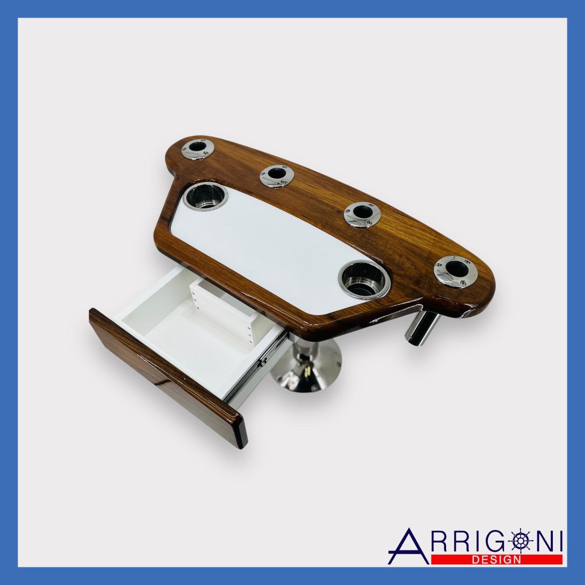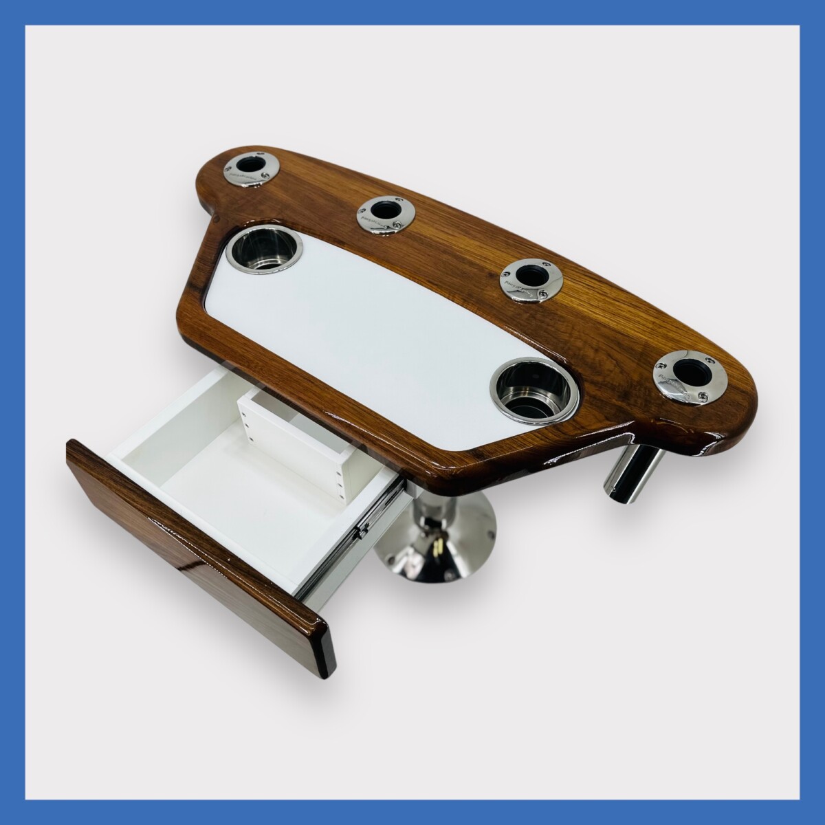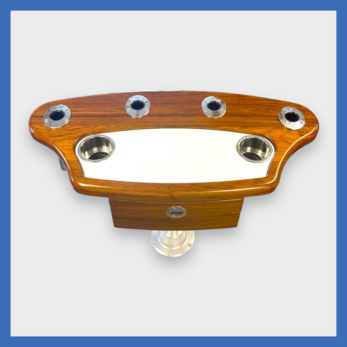 Arrigoni’s rod holder rocket launcher is a beautiful and functional accessory for your vessel. Hand crafted from the highest-quality materials in our Connecticut shop, we produce unlimited customizable options. Offering King Starboard and/or teak construction, all sizes, layouts and designs are available to meet your fishing demands. Decide your rod and cup holder layout, drawers for bait, terminal tackle, or lures, and multiple non-skid options. Working on a smaller platform? Our pedestal design allows boat owners to remove the pedestal and rocket launcher when not needed. Call today discuss pricing and build options!