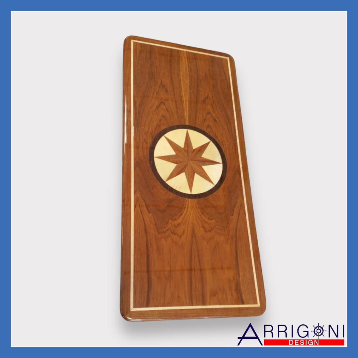 Pictured here are two rectangular teak table tops with rounded corners, featuring optional inlay stripe borders and compass roses.